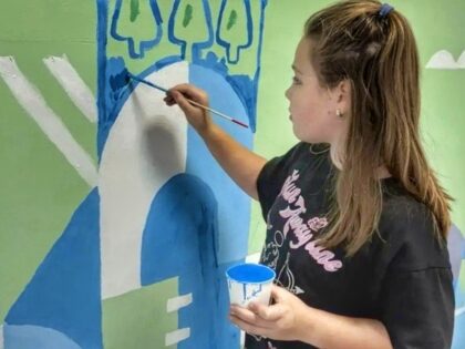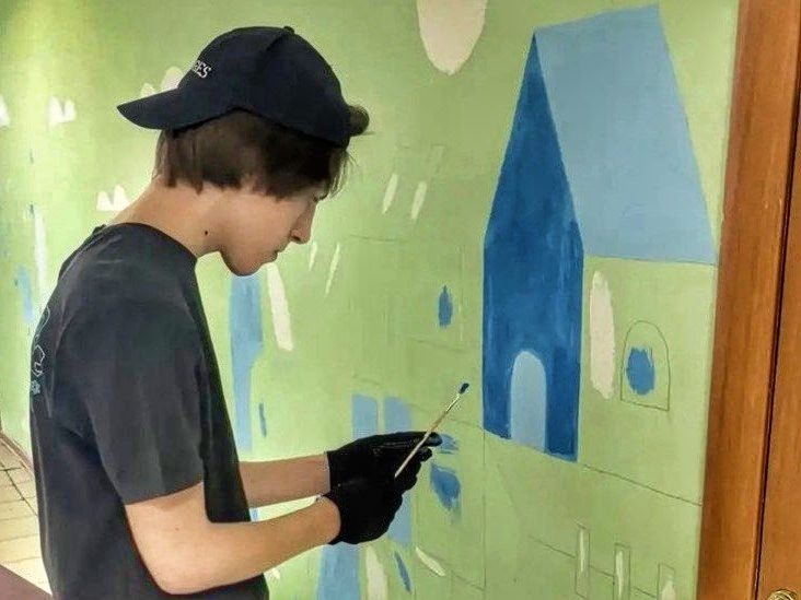 Учитель ИЗО разработал дизайн на основе цветов школьного логотипа. На стенах появились светлые домики, деревья и облака. Работы шли поэтапно: взрослые красили стены, а ученики рисовали по трафаретам.