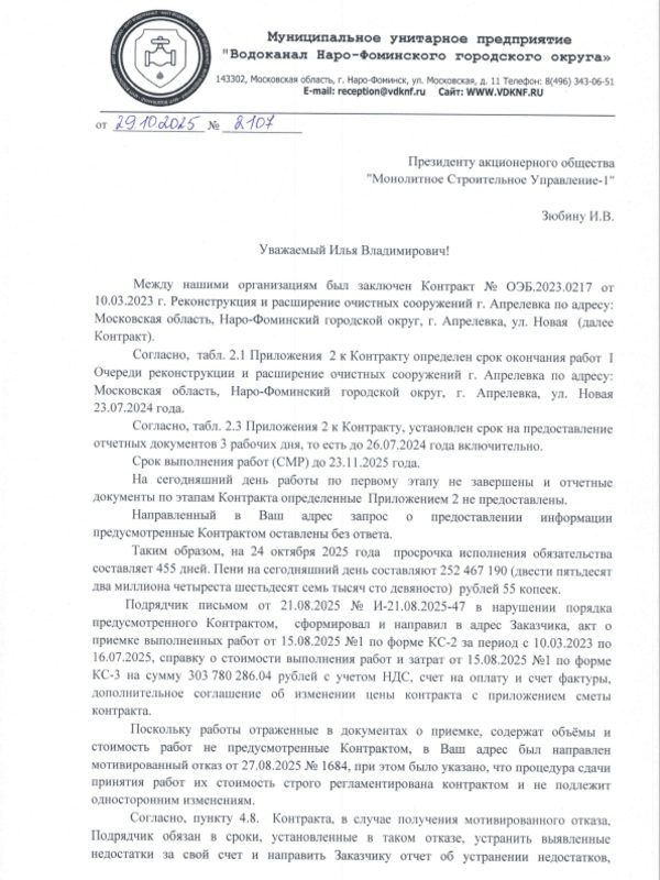 Но на этом история не закончилась. АО «Монолитное Строительное Управление-1» уже подало иск в Арбитражный суд Московской области. Компания намерена взыскать с водоканала более 300 млн рублей. Это значит, что вместо строительства стороны будут месяцами, а то и годами, судиться.