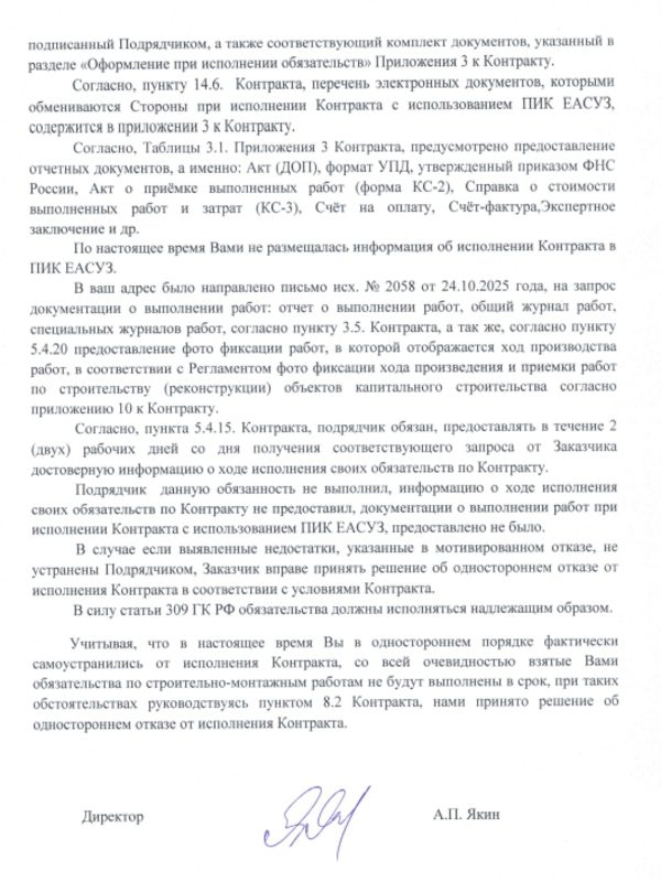 К октябрю 2025-го просрочка, по данным заказчика, превысила 455 дней. Подрядчик не вносил данные в систему ЕИС, игнорировал запросы о фотофиксации и журналах работ. Фактически, как заявляют в водоканале, компания самоустранилась.