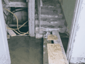 В Апрелевке жители дома №17 на ул. 1-Заводской теперь ходят по временному настилу — пол в подъезде обвалился, оставив яму с арматурой.